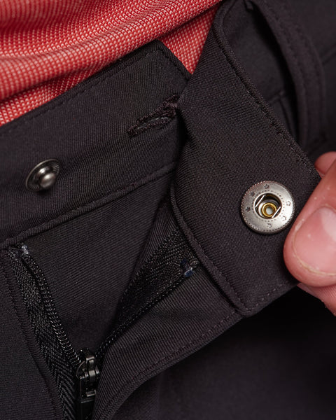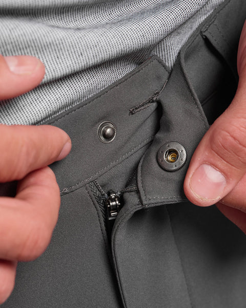 • Snap button closure with 5 1/2" zipper and gusset construction along crotch/inseam